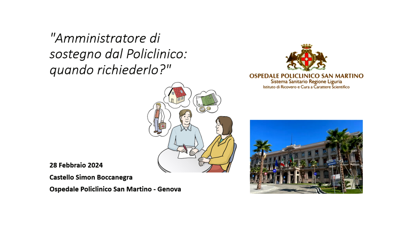 Questo corso di formazione è il frutto della registrazione dell'evento tenutosi presso il Castello Simon Boccanegra il 28 febbraio 2024, mantenendo solo le parti di interesse comune al fine di favorire la conoscenza dell'istituto dell'Amministratore di Sostegno.